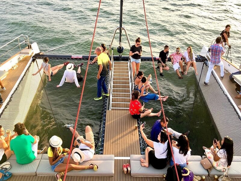 Con el sonido del viento y el movimiento suave del barco, se vive una experiencia única mientras el sol se oculta lentamente en el horizonte y las luces de la ciudad comienzan a encenderse.