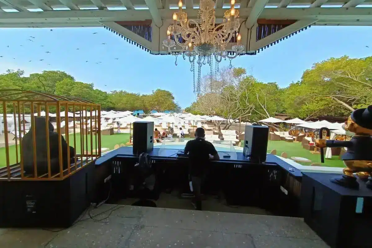 Este entorno sonoro se combina con la naturaleza que rodea el club, donde una comunidad de aves exóticas sobrevuela el cielo, aportando un componente visual y sensorial que eleva la experiencia y refuerza la conexión con el entorno.