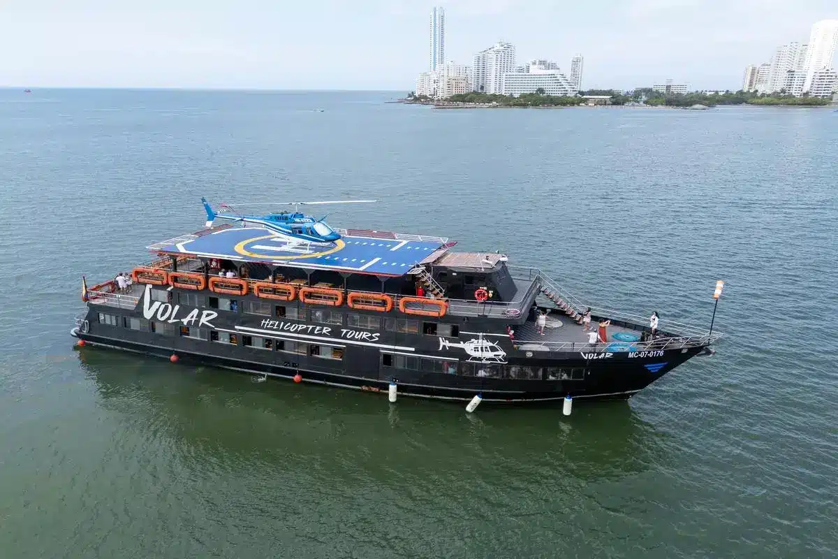 Este recorrido combina navegación por la Bahía de Cartagena, entretenimiento a bordo, gastronomía seleccionada y el momento más esperado: el sobrevuelo en helicóptero que permite admirar la ciudad desde una perspectiva privilegiada, reservada solo para unos pocos.